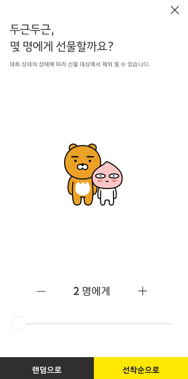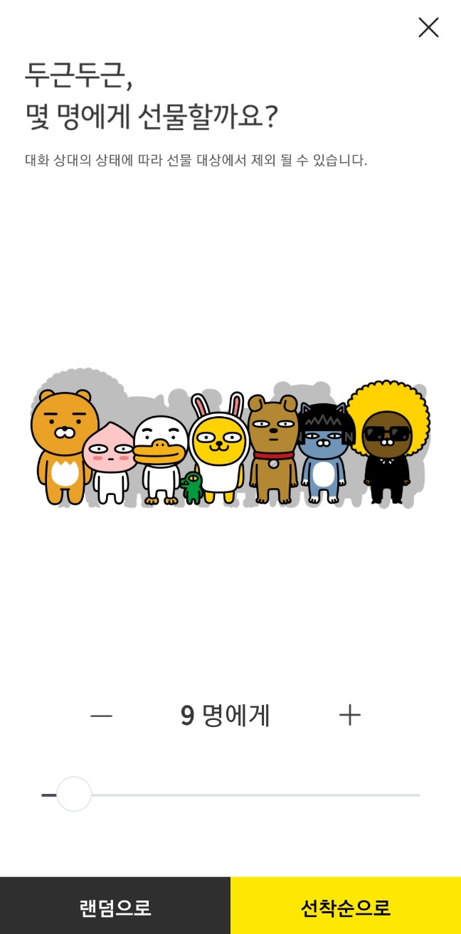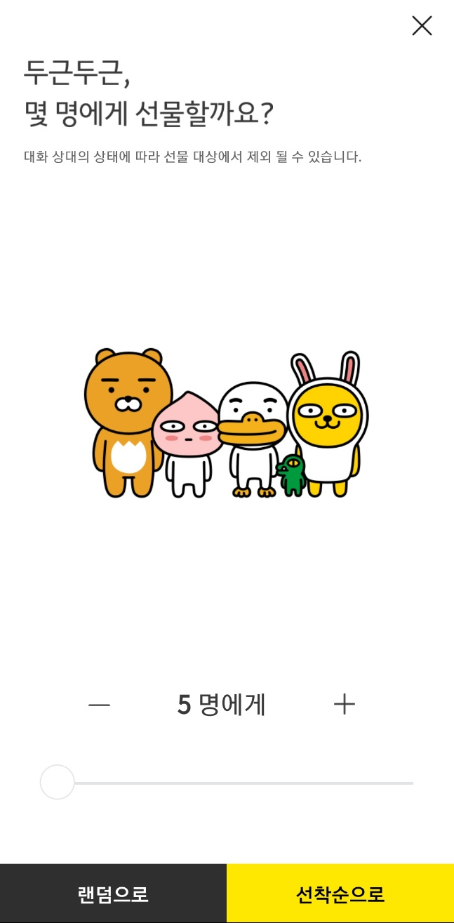 개인적으로 너무너무 귀여운 거는 카카오톡 랜덤선물 진행했을 때 한 명 두 명 고를 때 캐릭터가 점점 생겨나는데 저 멀뚱한 표정이 너무 귀엽습니다. 그래서 몇 명까지 나오는지 알아봤어요!